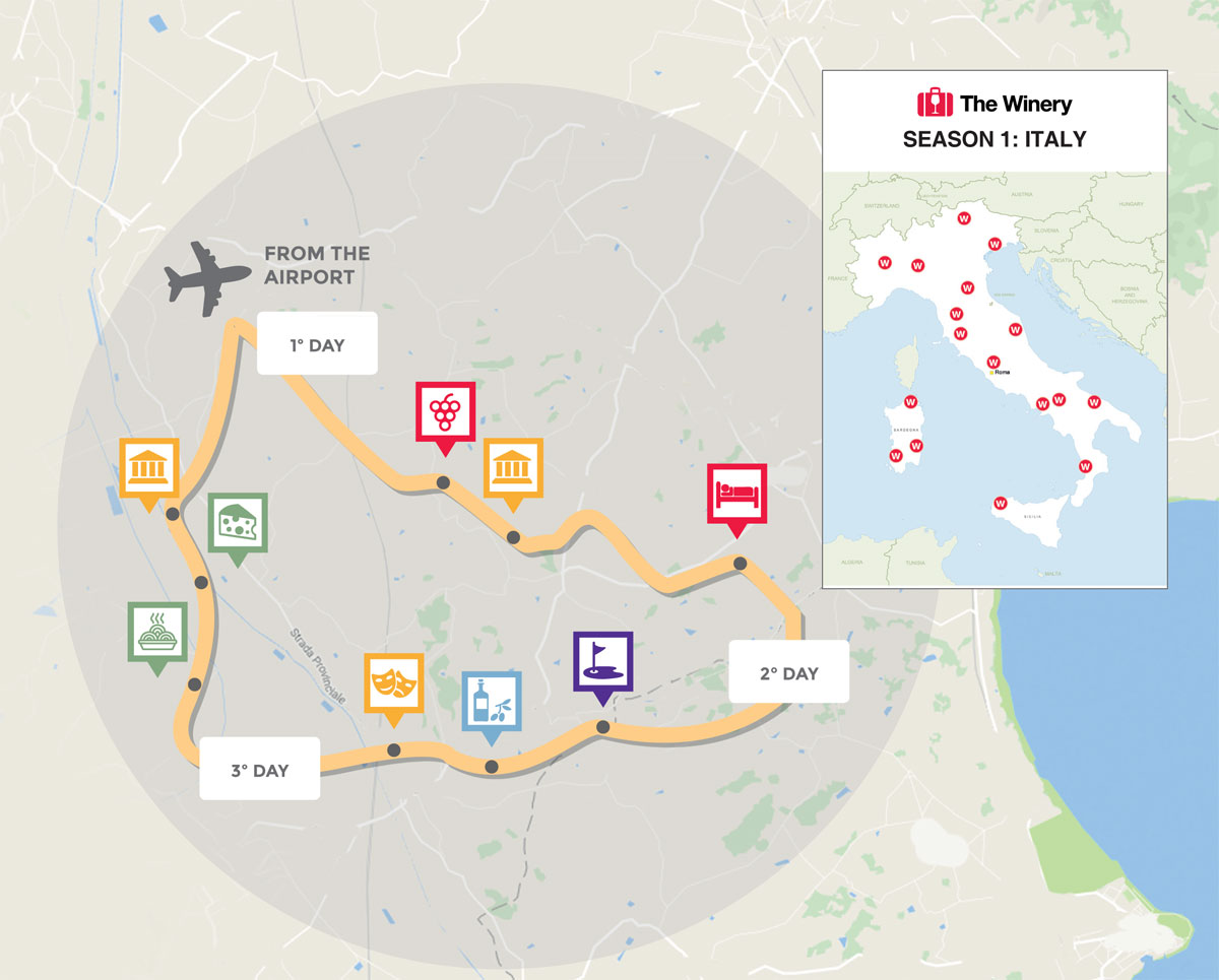 The episodes of The Winery last 26 minutes; they describe a city or a country, a factory producing wine, a receptive structure, cultural events and traditions of the territory, sports and relaxation.